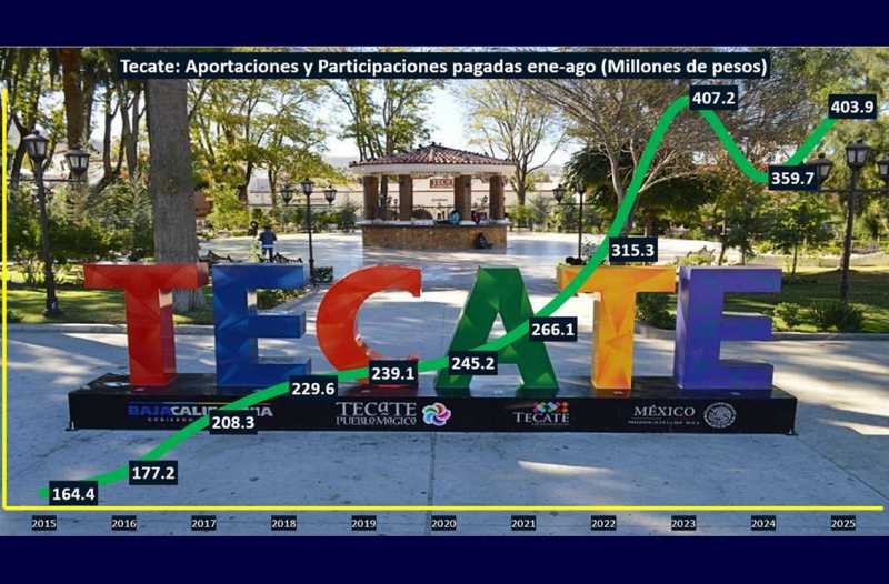 A pesar del incremento de Aportaciones y Participaciones para el gobierno de Tecate durante 2025, este no alcanzó su mayor nivel de transferencias realizadas en el lapso de mención de referencia que fue en 2023.