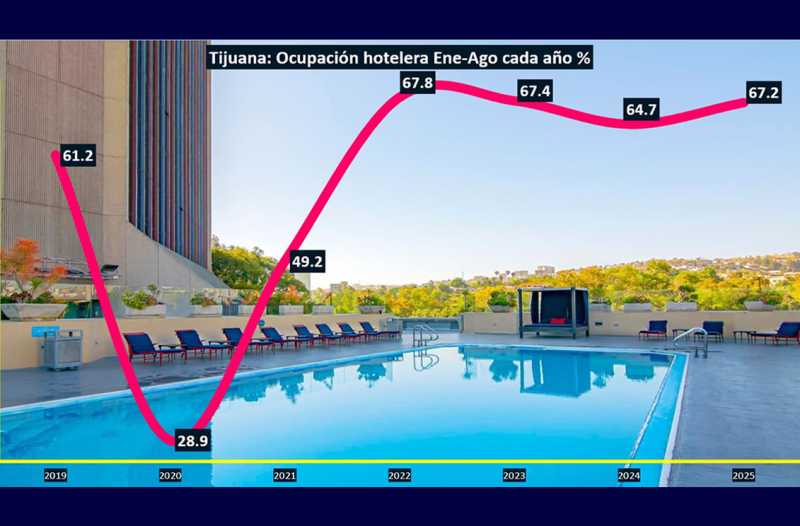 TIJUANA BC 28 DE OCTUBRE DE 2025 (AFN).- La ocupación hotelera de Tijuana se ubicó en 67.2% anual promedio en el lapso acumulado enero-agosto de 2025 por encimar del 64.7% anual promedio que registró en igual periodo de referencia de 2024, de acuerdo con las cifras de Datatur de la Secretaría de Turismo (SECTUR) federal.
