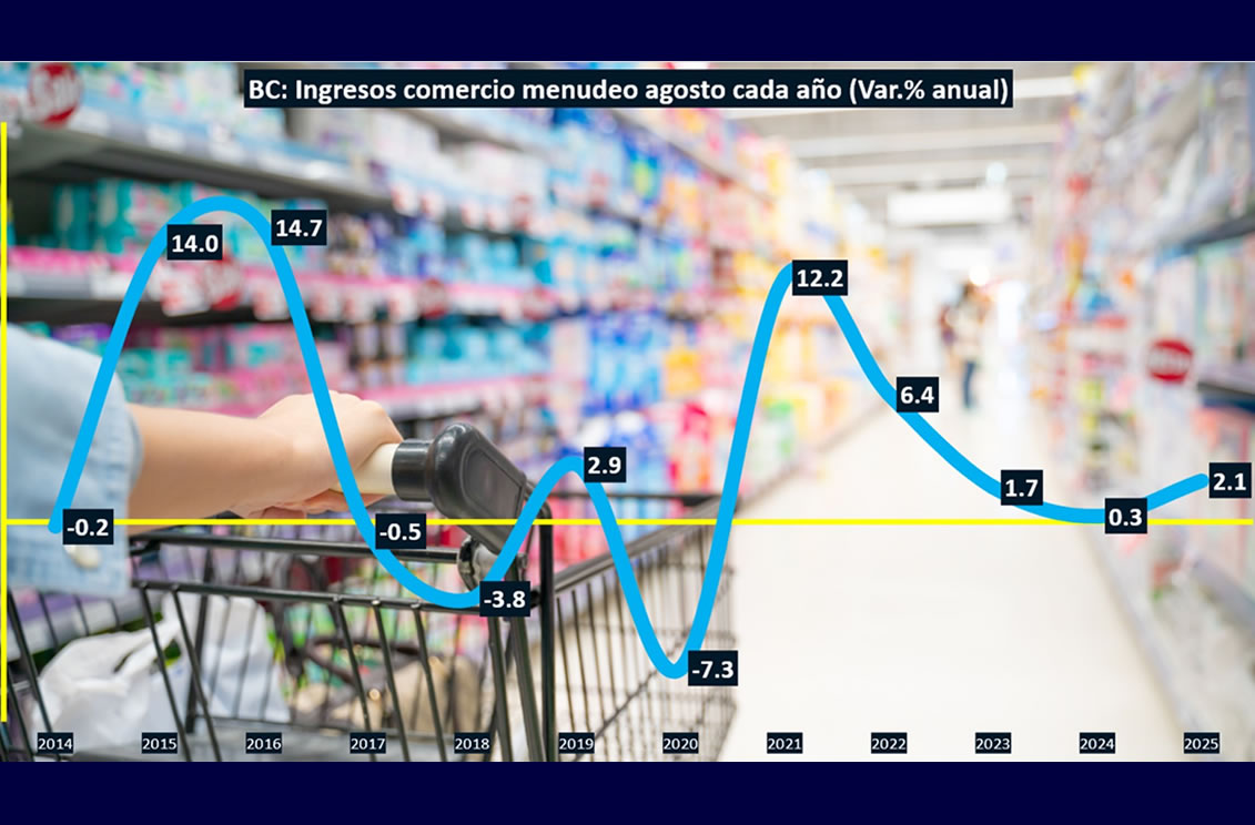 TIJUANA BC 31 DE OCTUBRE DE 2025 (AFN).- Las ventas del comercio organizado al menudeo de Baja California mostraron un aumento del 2.1% a tasa anual durante agosto de 2025 respecto al octavo mes de 2024, de acuerdo con la Encuesta Mensual sobre Empresas Comerciales (EMEC) del Instituto Nacional de Estadística y Geografía (INEGI).