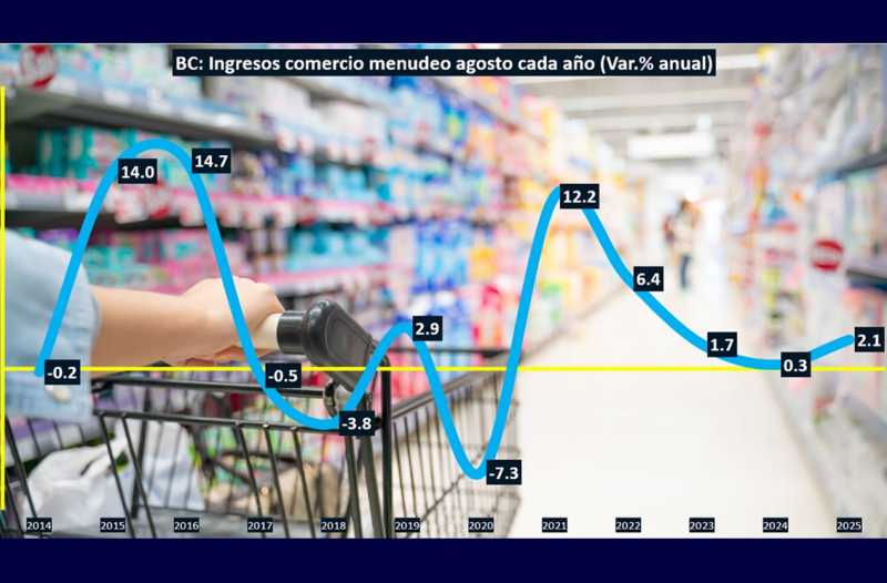 A pesar de documentarse un alza en las ventas del comercio minorista en el Estado durante agosto de 2025, todavía está lejos de alcanzar su mayor nivel reportado en 2022 en el orden del 6.4% a tasa anual. No se cuenta el 2021 dado que se iba saliendo de la pandemia.
