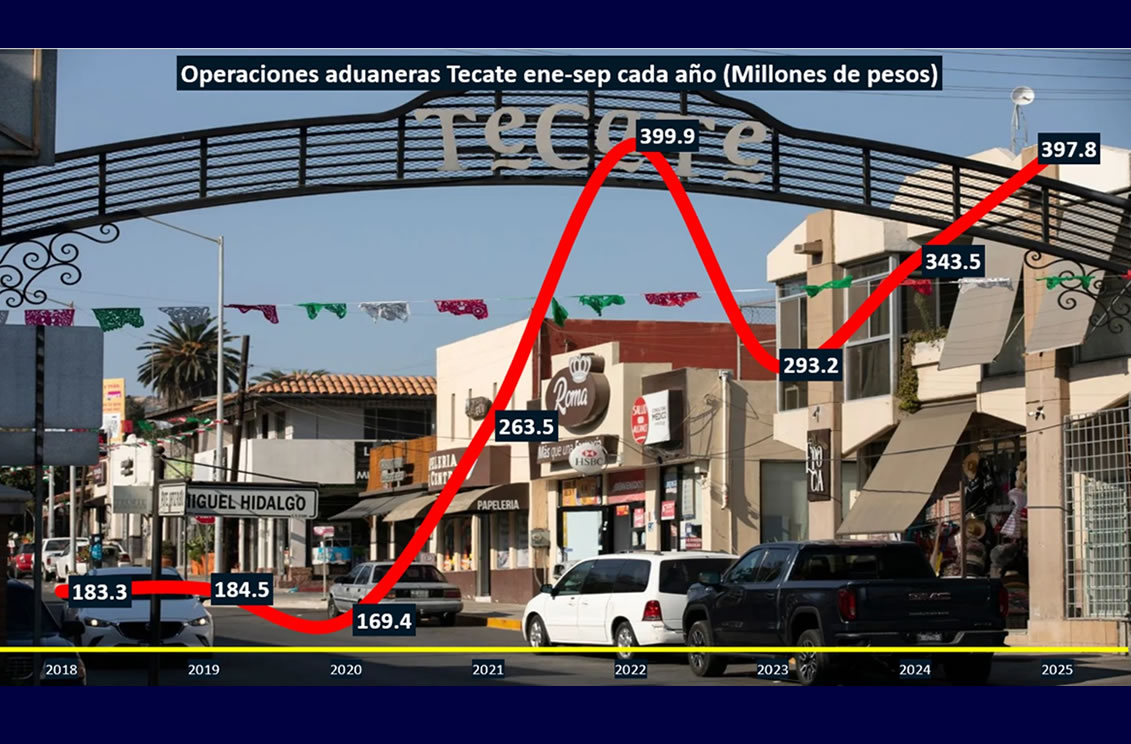 TIJUANA BC 1 DE NOVIEMBRE DE 2025 (AFN).- La recaudación por operaciones aduaneras por Tecate registró un incremento del 11.5% real a tasa anual durante el periodo acumulado enero-septiembre de 2025 respecto al mismo lapso, pero de pasado, de acuerdo con las cifras de la Agencia Nacional de Aduanas de México (ANAM),