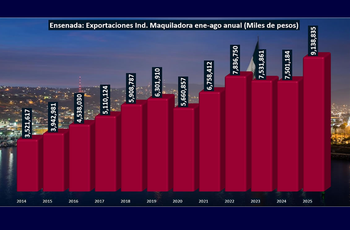 TIJUANA BC 1 DE NOVIEMBRE DE 2025 (AFN).- De acuerdo con las cifras del Instituto Nacional de Estadística y Geografía (INEGI), las exportaciones de la Industria Maquiladora en Ensenada aumentaron 21.8% a tasa anual en el periodo acumulado enero-agosto de 2025.