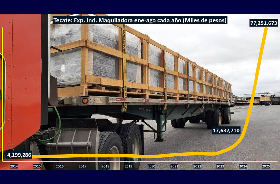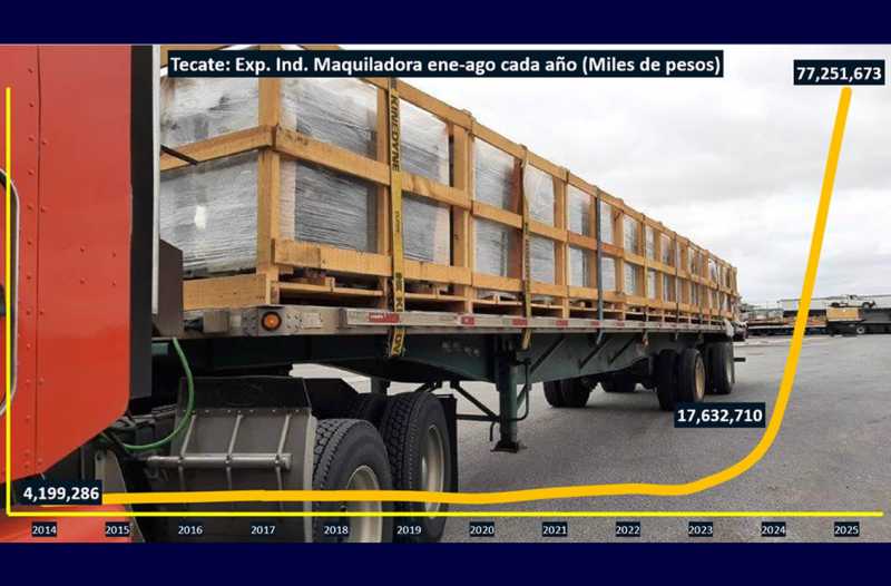 TIJUANA BC 4 DE NOVIEMBRE DE 2025 (AFN).- Las exportaciones de la Industria Maquiladora en Tecate continúan con fuertes aumentos al alcanzar un 338.1% a tasa anual en el lapso acumulado enero-agosto de 2025 respecto a los mismos ocho meses de 2024, de acuerdo con los resultados del Instituto Nacional de Estadística y Geografía (INEGI).