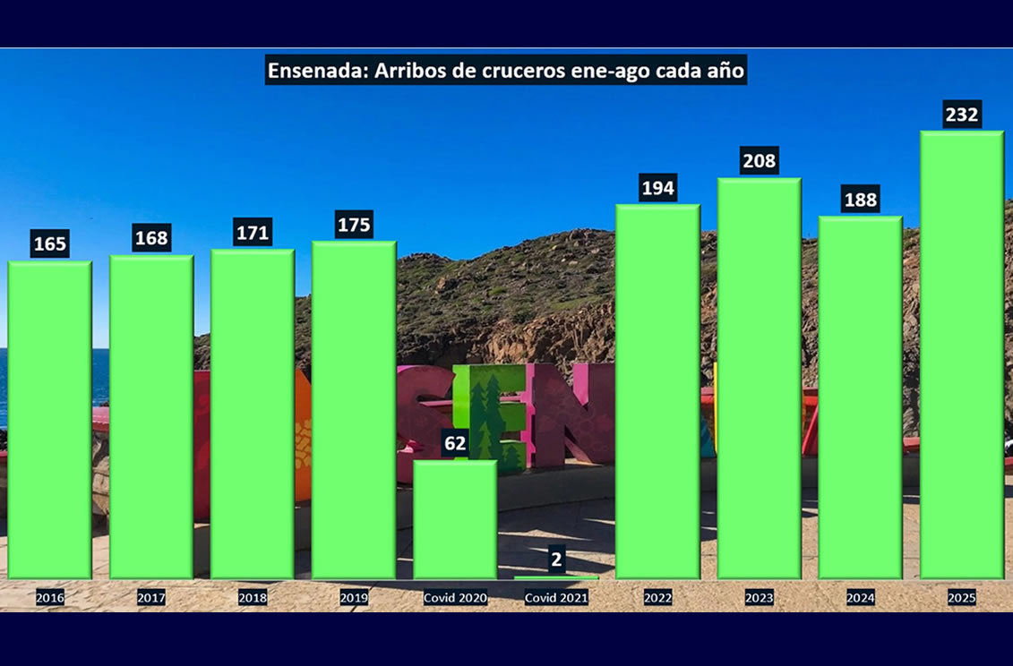 TIJUANA BC 8 DE NOVIEMBRE DE 2025 (AFN).- Los arribos por crucero en Ensenada reportaron un incremento del 23.4% a tasa anual en el lapso acumulado enero a agosto de 2025 en comparación al mismo periodo de 2024, arrojan las cifras de DATATUR de la Secretaría de Turismo (SECTUR) federal.