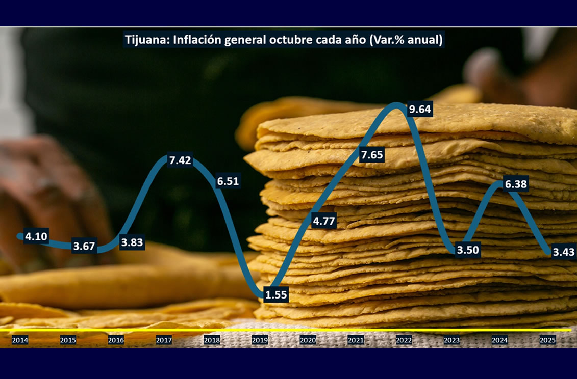 TIJUANA BC 10 DE NOVIEMBRE DE 2025 (AFN).- La inflación general de Tijuana fue de 0.23% en octubre de 2025 para llegar la anualizada a 3.43% por debajo del 6.38% que marcó en el décimo mes de 2024, de acuerdo con los datos que dio a conocer el Instituto Nacional de Estadística y Geografía (INEGI).