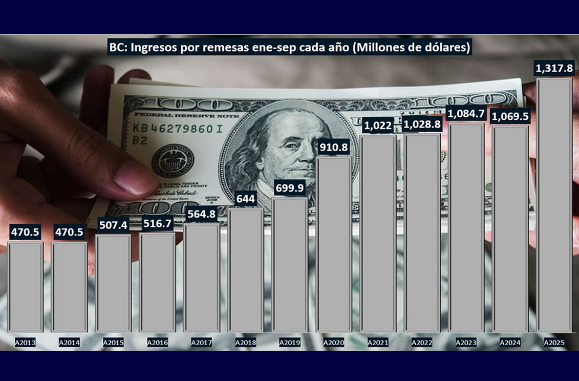 TIJUANA BC 19 DE NOVIEMBRE DE 2025 (AFN).- Los ingresos por remesas familiares hacia Baja California se dispararon 23.2% a tasa anual en el lapso acumulado enero-septiembre de 2025 en comparación al mismo periodo, pero del año anterior, de acuerdo con las cifras que dio a conocer el Banco de México (Banxico).