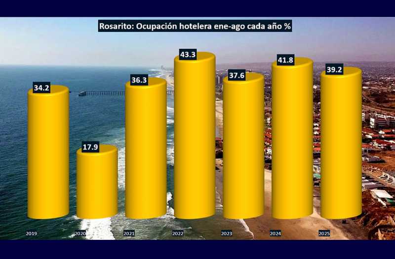 En ese sentido, al 31 de agosto de 2025, la ocupación hotelera de Rosarito se situó en 39.2% en promedio cifra menor al 41.8% que registró en promedio al 31 de agosto de 2024, según las cifras del gobierno federal.