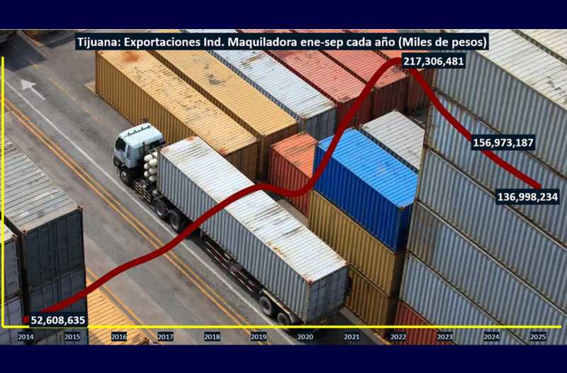 TIJUANA BC 5 DE DICIEMBRE DE 2025 (AFN).- Las exportaciones de la Industria Maquiladora en Tijuana documentaron una caída del 12.7% a tasa anual al 31 de octubre de 2025 en comparación a las cifras al 31 de octubre de 2024, de acuerdo con los datos del Instituto Nacional de Estadística y Geografía (INEGI).