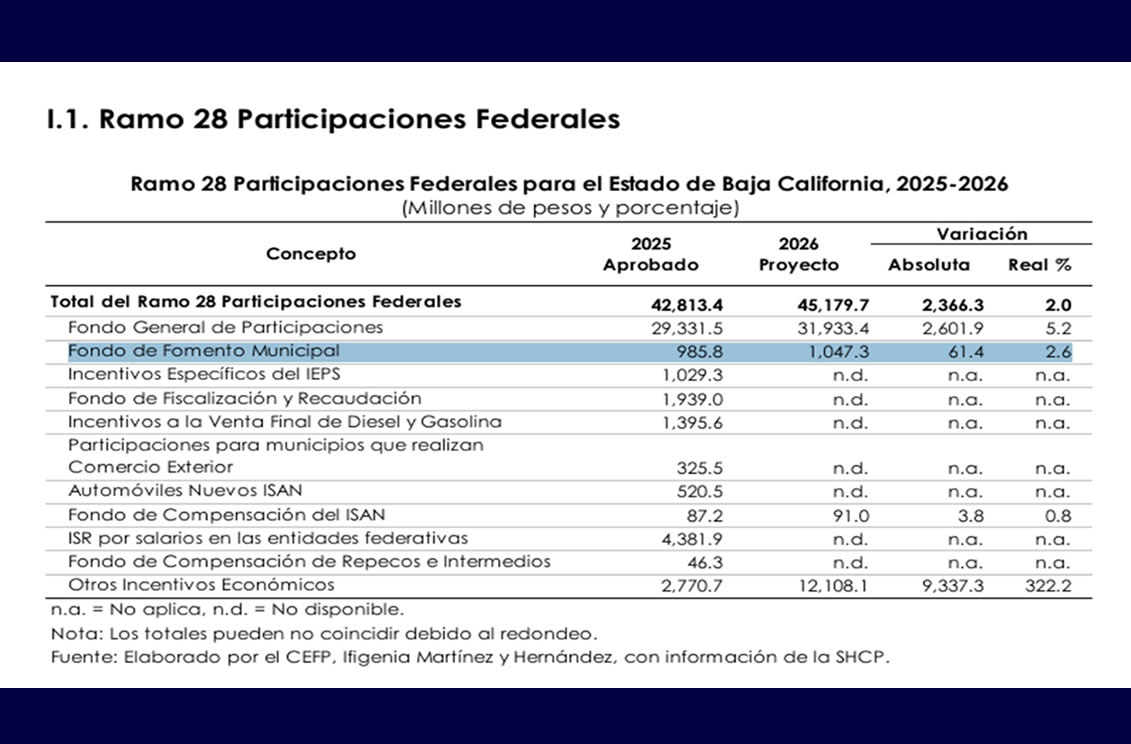 TIJUANA BC 8 DE DICIEMBRE DE 2025 (AFN).- Los siete ayuntamientos de Baja California contarán con un aumento del 2.6% real anual en el Fondo de Fomento Municipal (FFM) para el próximo año, tras la aprobación del Presupuesto de Egresos de la Federación (PEF) 2026.