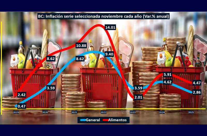 En ese sentido, el organismo estadístico documentó que la inflación de los alimentos fue de 4.47% a tasa anual en noviembre del presente año, por debajo del indicador del 2024, pero por arriba de la variación general de Baja California.