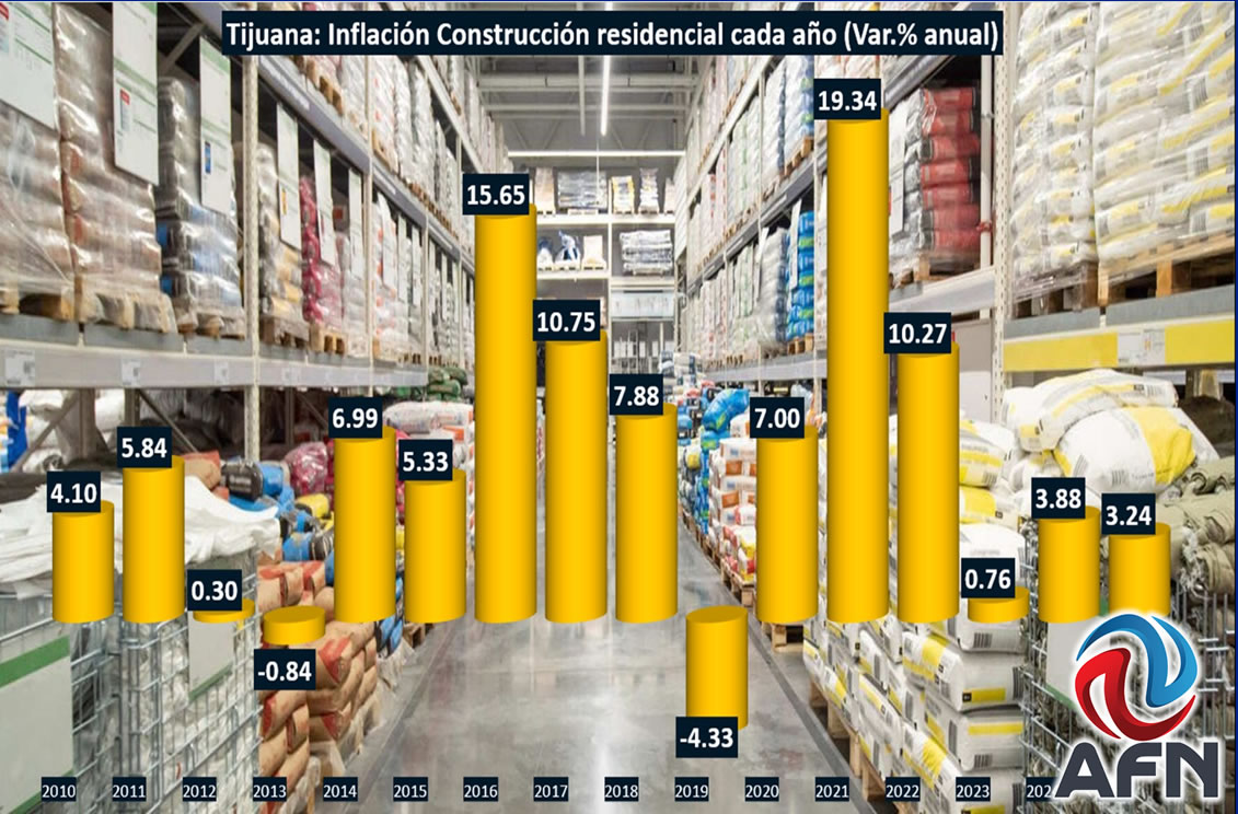 TIJUANA, BC, 17 DE ENERO DE 2026 (AFN).- La inflación para las empresas constructoras de Tijuana reportó una desaceleración del 3.24% a tasa anual durante 2025 en comparación al 3.88% a tasa anual que colocó en 2024, de acuerdo con las cifras actualizadas del Instituto Nacional de Estadística y Geografía (INEGI).