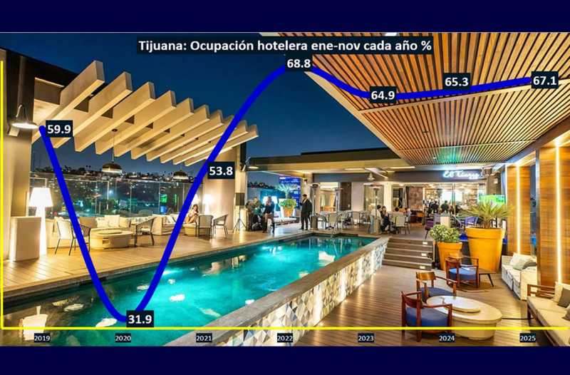 TIJUANA BC 21 DE ENERO DE 2026 (AFN).- El sector hotelero de Tijuana registró un aumento en la ocupación al situarse en 67.1% a tasa anual durante el periodo enero-noviembre de 2025 en comparación al mismo lapso acumulado de 2024 que se ubicó 65.3% a tasa anual, arrojan los resultados de DATATUR de la Secretaría de Turismo (SECTUR) federal.