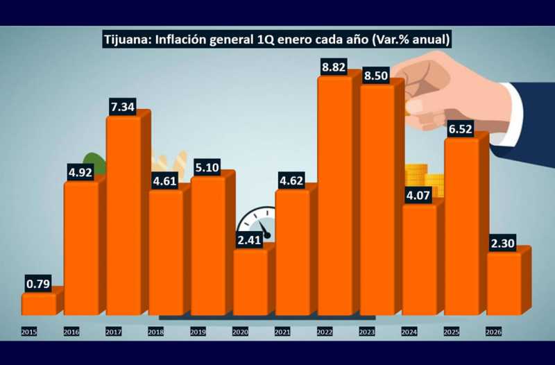 TIJUANA BC 23 DE ENERO DE 2026 (AFN).- La inflación general en Tijuana llegó a 2.30% a tasa anual en la primera quincena de enero de 2026 para situarse debajo del 6.52% a tasa anual que registró para ese mismo lapso, pero del año anterior, de acuerdo con los resultados publicados por el Instituto Nacional de Estadística y Geografía (INEGI).
