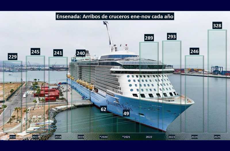 Regresando a los datos de la SECTUR federal para Ensenada, fueron 328 los arribos de cruceros al 31 de noviembre de 2025 por encima de las 246 visitas por crucero reportadas al 31 de noviembre de 2024.