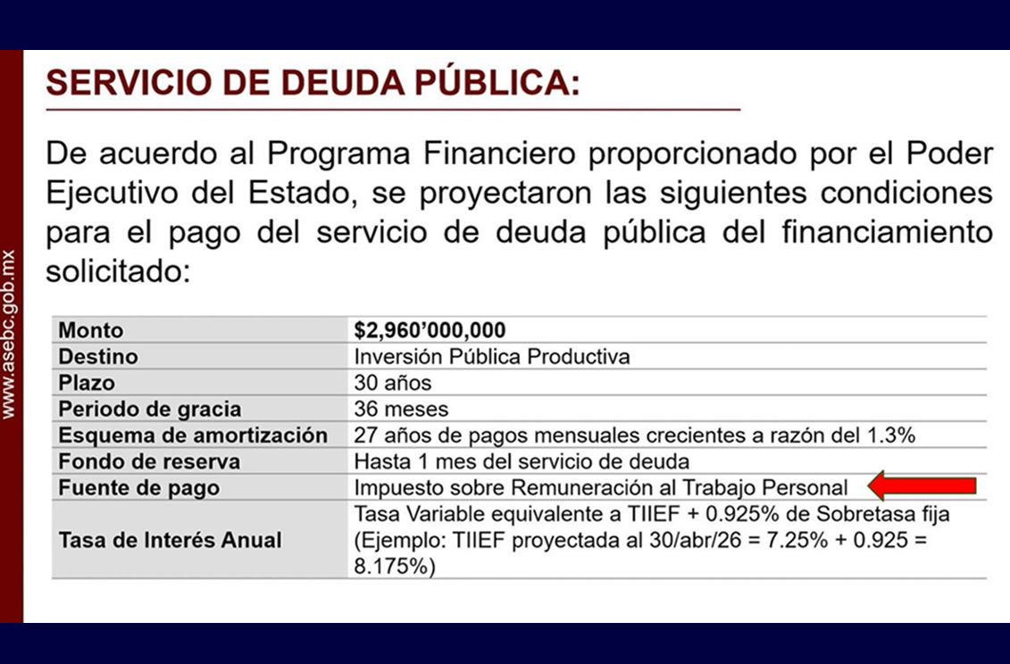 TIJUANA BC 5 DE FEBRERO DE 2026 (AFN).- La contratación de deuda pública para obras complementarias para la desaladora de Playas de Rosarito que ya con intereses llegará a cerca de los 9 mil 800 millones de pesos (mdp) a liquidar hasta 2056, la pagarán los empresarios de Baja California a través de Impuesto Sobre Nómina (ISN).