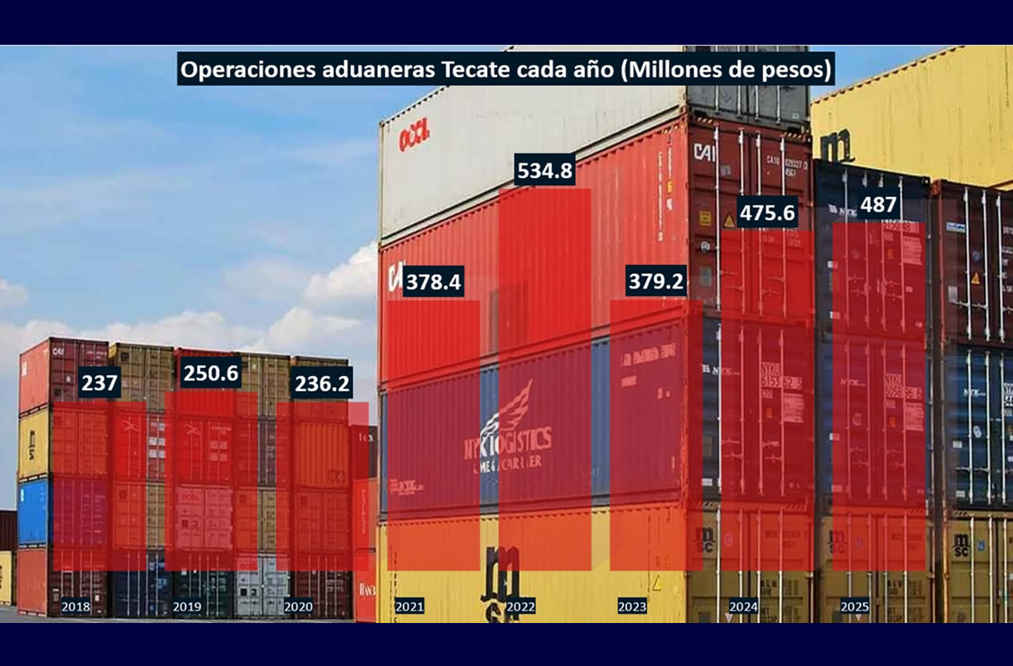 TIJUANA BC 7 DE FEBRERO DE 2026 (AFN).- La recaudación por operaciones aduaneras en Tecate cayó 1.3% real a tasa anual durante el ejercicio fiscal del 2025 en comparación al comportamiento del 2024, de acuerdo con las cifras de la Agencia Nacional de Aduanas de México (ANAM).