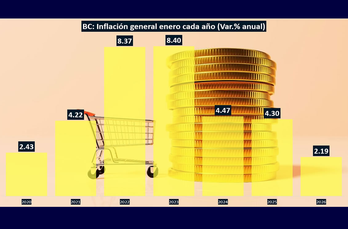TIJUANA BC 9 DE FEBRERO DE 2026 (AFN).- La inflación general de Baja California fue de 0.11% durante enero de 2026 para llegar a una tasa anualizada de 2.19% en comparación al 4.30% a tasa anual que registró en el mismo mes del año anterior, de acuerdo con las cifras que dio a conocer hoy el Instituto Nacional de Estadística y Geografía (INEGI).