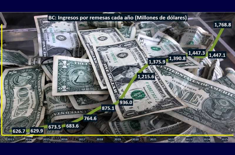 En valores absolutos, al Estado llegaron Mil 768.8 millones de dólares de remesas familiares durante 2025 para superar los Mil 447.1 millones de dólares enviados por los connacionales en el ejercicio fiscal 2024, indican los datos del banco central.