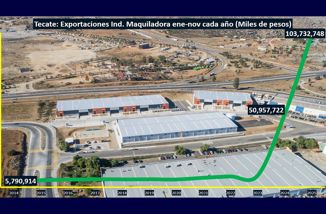 TIJUANA, BC, 14 DE FEBRERO DE 2026 (AFN).- Las exportaciones de la Industria Maquiladora en Tecate continúan imparables para sacar adelante la movilización de mercancías en el total de Baja California, de acuerdo con las cifras del Instituto Nacional de Estadística y Geografía (INEGI) para el lapso acumulado enero a noviembre de 2025.
