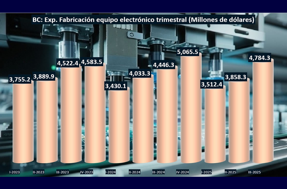 Las exportaciones de mercancías de la Industria Electrónica en el Estado participan con el 12.6% del volumen total que se registró en Baja California entre julio y septiembre de 2025, cuyo principal destino son los Estados Unidos.