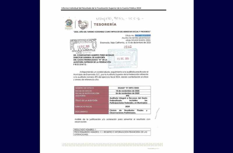 A través de la “Auditoría Integral a Recursos del Gasto Federalizado, Incluidas las Participaciones Federales, en Municipios” número 495, de la que cuenta con copia AFN Noticias, al Ayuntamiento de Ensenada se del descubrió que no cuenta con registro contable presupuestal.