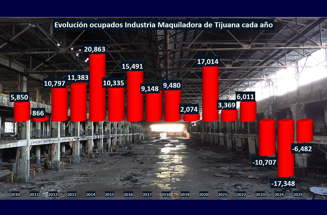 Las cifras del organismo gubernamental para Tijuana indican la pérdida de 34 mil 537 ocupados en las plantas manufactureras de exportación, consecuencia de la revisión de los datos al 31 de diciembre de 2025 cuando cerró con 225 mil 114 trabajadores por debajo de los 259 mil 651 ocupados que había al 31 de diciembre de 2022.