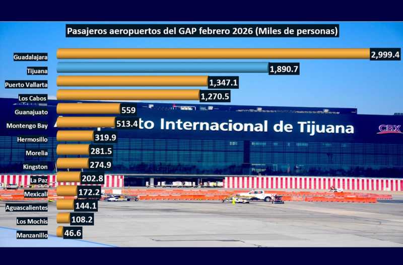 Por lo que respecta a los pasajeros internacionales por Tijuana, las cifras del GAP indican una reducción de 9.3% a tasa anual durante el primer bimestre de 2026 en comparación al mismo lapso, pero del año anterior.