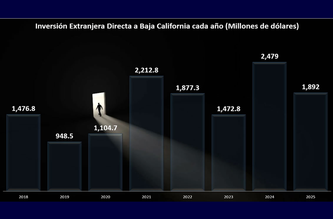 TIJUANA BC 11 DE MARZO DE 2026 (AFN).- La inversión extranjera directa (IED) hacia Baja California se desplomó 23.7% a tasa anual durante 2025 en comparación al periodo enero a diciembre de 2024, de acuerdo con las cifras preliminares del Registro Nacional de Inversión Extranjera (RNIE) de la Secretaría de Economía (SECON) federal.