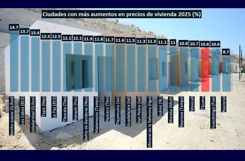 Asimismo, el Índice de la SHF indica que el precio de la vivienda en Tijuana se colocó por encima del 8.7% a tasa anual promedio que documentó el costo de las casas habitacionales a nivel nacional durante enero a diciembre del ejercicio fiscal 2025.
