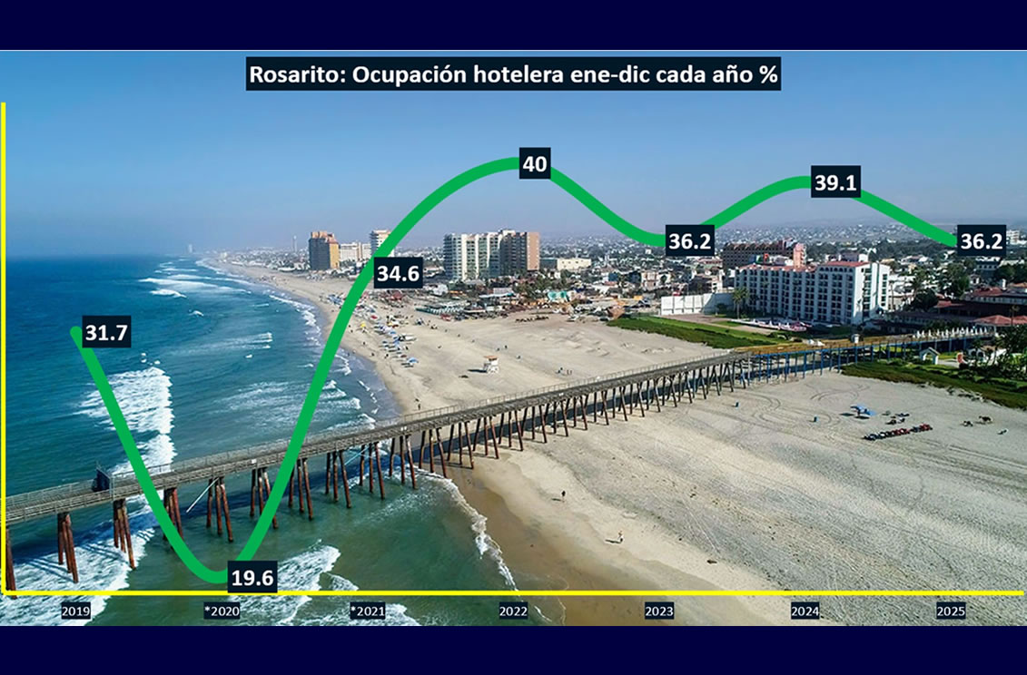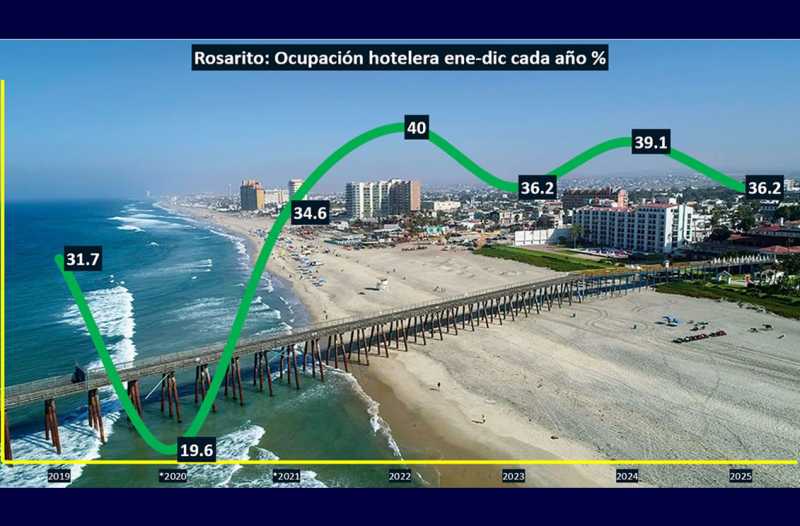 TIJUANA BC 21 DE MARZO DE 2026 (AFN).- En Playas de Rosarito, la ocupación hotelera no levantó para terminar en 36.2% anual en promedio durante 2025 respecto al 39.1% anual promedio reportado entre enero a diciembre de 2024, indican los resultados de DATATUR de la Secretaría de Turismo (SECTUR) federal.