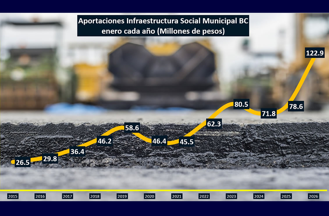 TIJUANA BC 21 DE MARZO DE 2026 (AFN).- La Secretaría de Hacienda y Crédito Público (SHCP) aumentó 50.7% real a tasa anual los recursos públicos para obras de infraestructura social para los municipios de Baja California durante enero de 2026 en comparación al mismo mes de 2025.