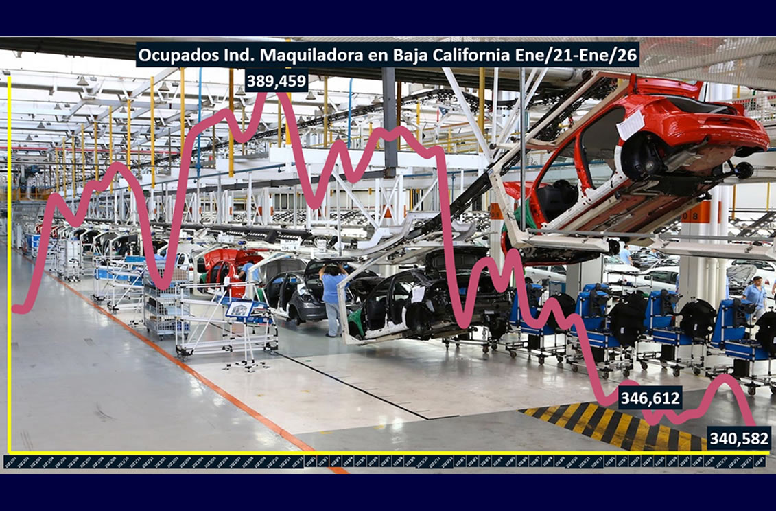 TIJUANA BC 25 DE MARZO DE 2026 (AFN).- Los ocupados en la Industria Maquiladora en Baja California reportaron una reducción del 1.7% a tasa anual durante enero de 2026 respecto al mismo mes, pero del año inmediato anterior, afectando la producción, arrojan las cifras del Instituto Nacional de Estadística y Geografía (INEGI).