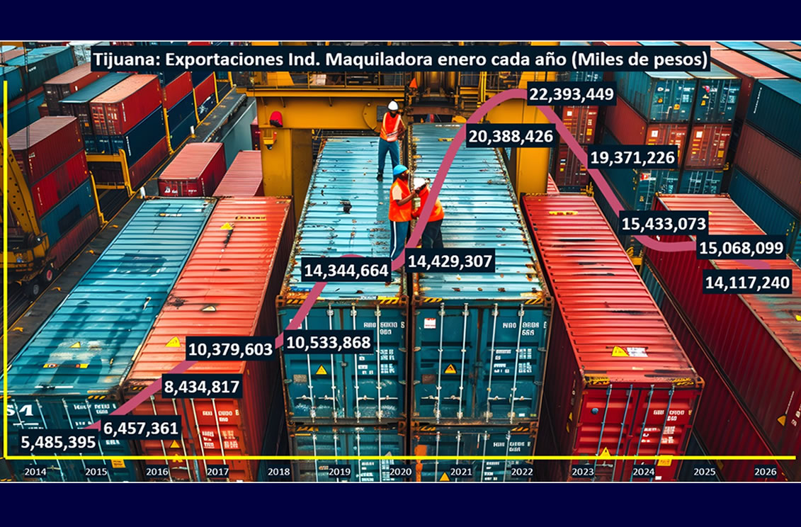 TIJUANA BC 31 DE MARZO DE 2026 (AFN).- Las exportaciones de la Industria Maquiladora en Tijuana reportaron una contracción del 6.3% a tasa anual en enero de 2026 en comparación al mismo lapso, pero del año pasado, arrojan los resultados actualizados del Instituto Nacional de Estadística y Geografía (INEGI).