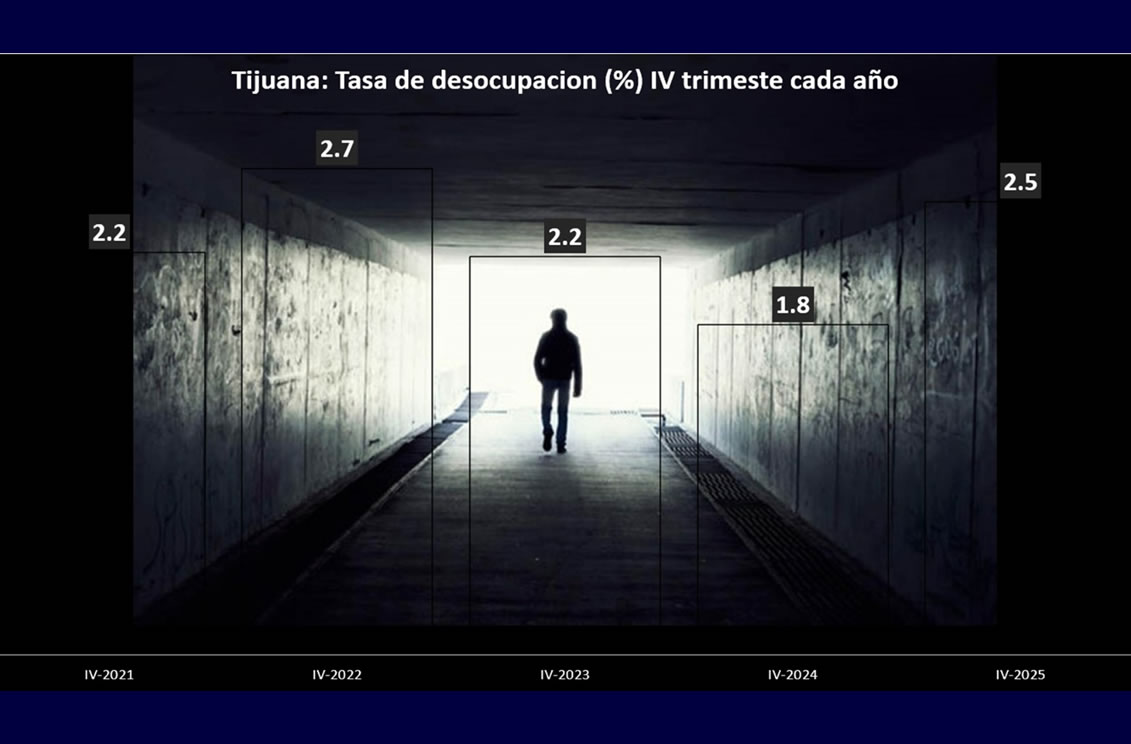 TIJUANA BC 31 DE MARZO DE 2026 (AFN).- La tasa de desocupación (TD) de la Población Económicamente Activa (PEA) de Tijuana se situó en 2.5% en el cuarto trimestre de 2025, es decir, 0.7 puntos porcentuales por arriba del 1.8% a tasa anual que mostró en el cuarto trimestre de 2024, de acuerdo con la Encuesta Nacional de Ocupación y Empleo (ENOE) que realiza el INEGI.