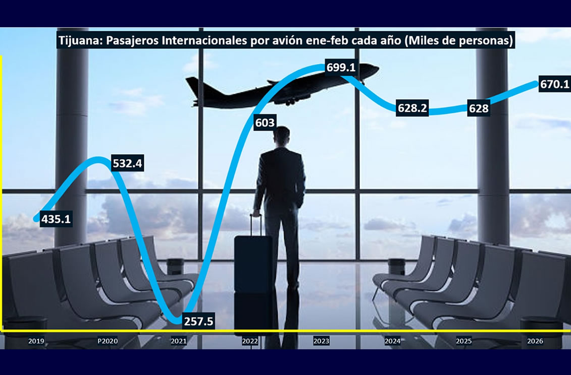 TIJUANA BC 2 DE ABRIL DE 2026 (AFN).- En Tijuana, el turismo de negocios se benefició tras aumentar 6.7% a tasa anual la llegada de pasajeros internacional por el Aeropuerto al primer bimestre de 2026 respecto al mismo lapso del 2025, de acuerdo con datos del Banco de México (Banxico) y el Grupo Aeroportuario del Pacífico (GAP).
