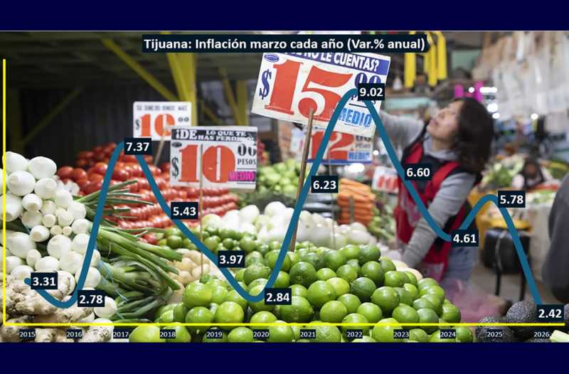 TIJUANA BC 13 DE ABRIL DE 2026 (AFN).- La inflación general de Tijuana llegó a 2.42% a tasa anual durante marzo de 2026 en comparación al 5.78% a tasa anual que registró en ese mismo mes, pero del año anterior, de acuerdo con las cifras que dio a conocer el Instituto Nacional de Estadística y Geografía (INEGI).