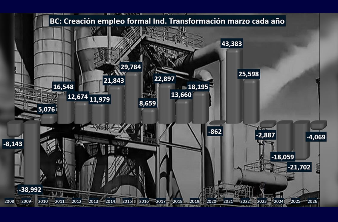 TIJUANA BC 14 DE ABRIL DE 2026 (AFN).- En Baja California, la Industria de la Transformación atraviesa por la peor crisis de su historia al hilar cuatro años reportando recortes de trabajadores formales, arrojan las cifras que dio a conocer el Instituto Mexicano del Seguro Social (IMSS) al corte de marzo de 2026.