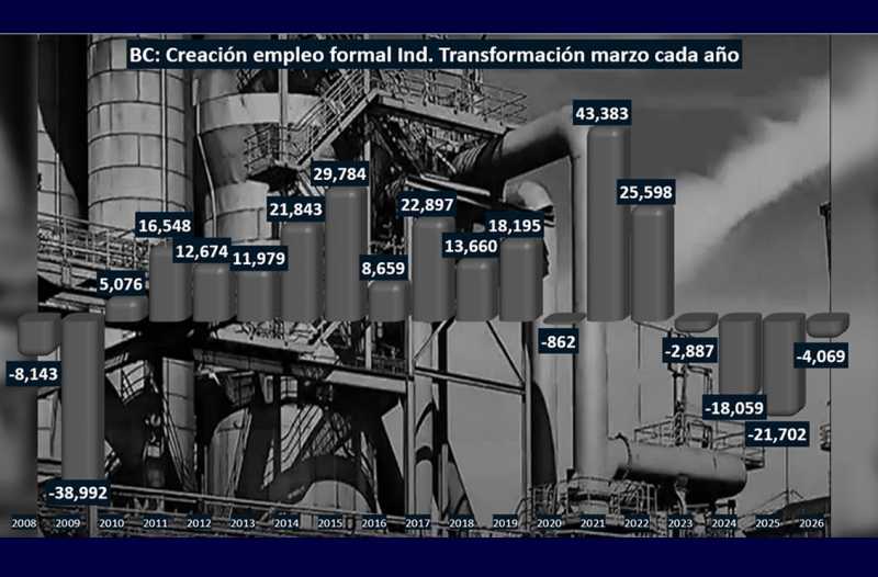 En la revisión a los datos del IMSS sobre la evolución del mercado laboral del sector industrial nacional de Baja California, se reportan para un marzo contra marzo de cada año los siguientes resultados: en 2023 perdió 2 mil 887 trabajadores; en 2024 perdió 18 mil 059 trabajadores; en 2025 perdió 21 mil 702 trabajadores; y en 2026 perdió 4 mil 069 trabajadores.