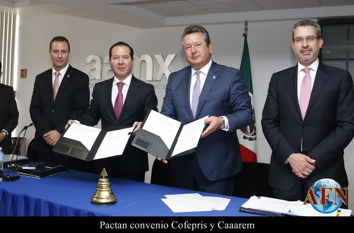 MEXICO DE 29 DE ABRIL DE 2016 (AFN).-A fin de simplificar trámites que eliminen barreras y faciliten el comercio de insumos para la salud, en beneficio de los mexicanos, este día firmaron un acuerdo de colaboración el Comisionado Federal para la Protección contra Riesgos Sanitarios, (Cofepris) Julio Sánchez y Tépoz, y el presidente de Agentes Aduanales de la República Mexicana (Caaarem), José Antonio Vidales.