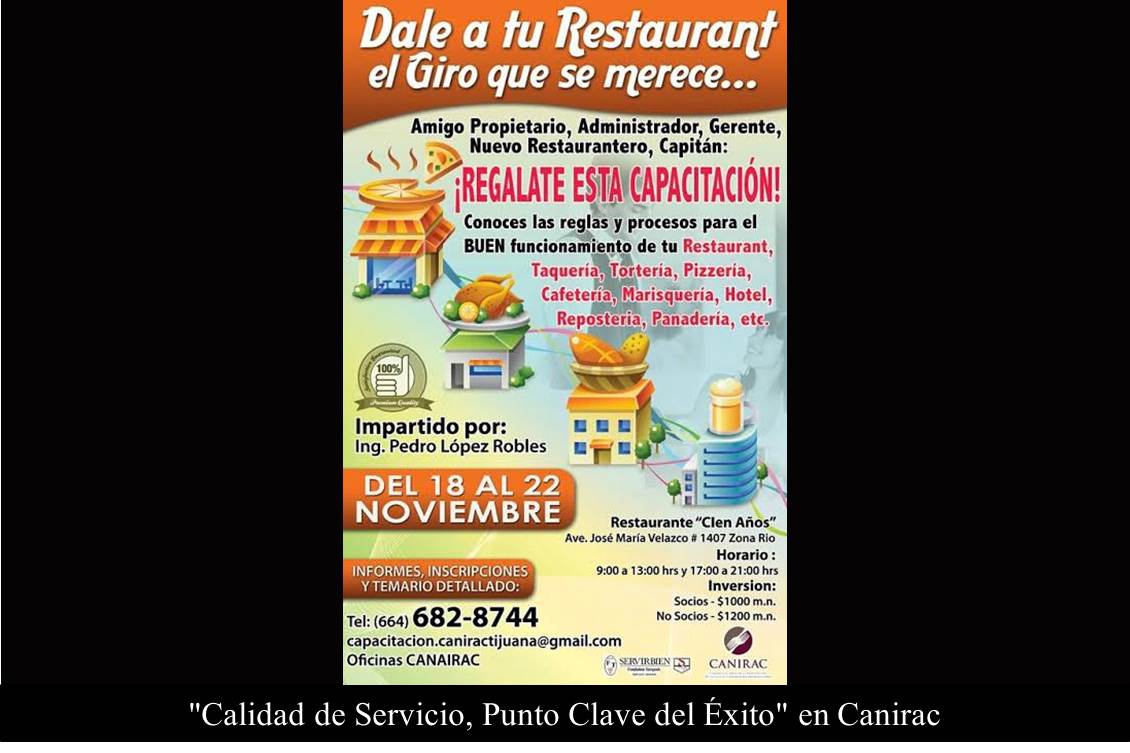 TIJUANA BC 19 DE junio de 2016 (AFN).- La Cámara Nacional de la Industria de Restaurantes y Alimentos Condimentados (CANIRAC), la Fundation Turquois y SERVIRBIEN están invitando sus agremiados a registrarse con tiempo a su próximo Curso-Taller "Calidad en el Servicio Punto Clave de Éxito en un Restaurante".