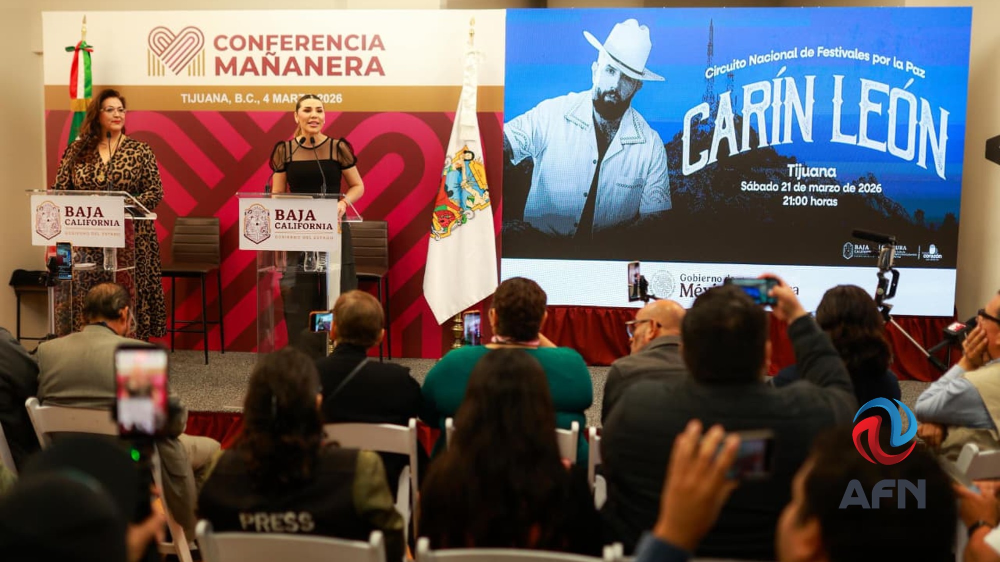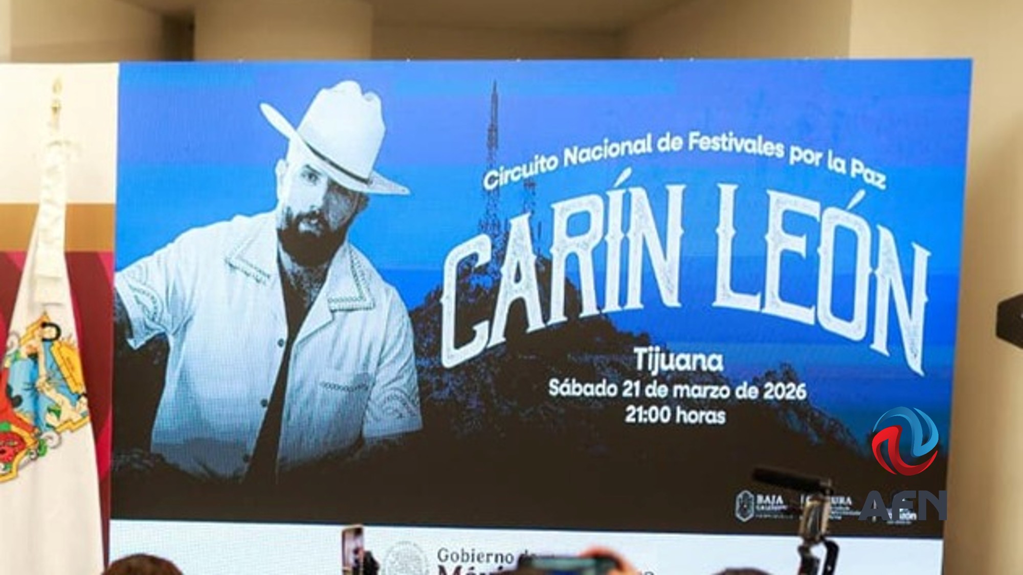 TIJUANA BC 4 DE MARZO DE 2026 (AFN).- El próximo 21 de marzo el cantante Carín León ofrecerá un concierto gratuito en Tijuana, como parte del inicio del Circuito Nacional de Festivales por la Paz, confirmó la gobernadora de Baja California Marina del Pilar Ávila Olmeda.