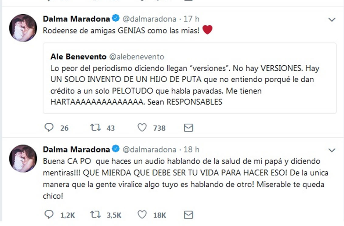 Sin embargo, la molestia de la hija del ex jugador no paró ahí y en otro texto agregó: “¡¡¡Buena CAPO que haces un audio hablando de la salud de mi papá y diciendo mentiras!!! ¡QUE MIERDA QUE DEBE SER TU VIDA PARA HACER ESO! ¡De la única manera que la gente viralice algo tuyo es hablando de otro! ¡Miserable te queda chico!”.