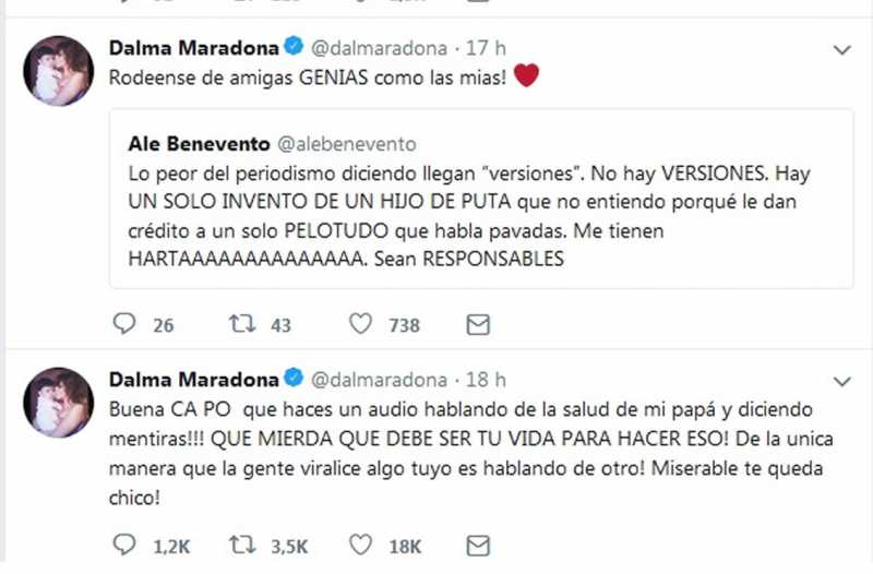 MÉXICO 28 JUNIO 2018 (Agencia México).- Dalma Maradona, hija de Diego Armando Maradona, estalló en redes sociales después de que se corriera el rumor y un audio sobre la muerte de su padre tras el inconveniente de salud que el argentino tuvo durante el partido de la selección Albiceleste contra de Nigeria.