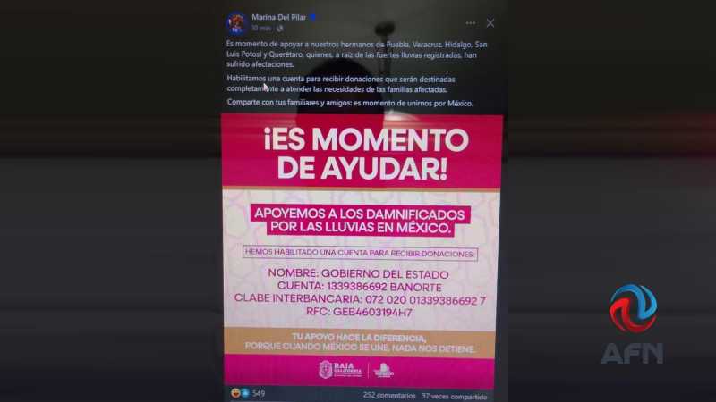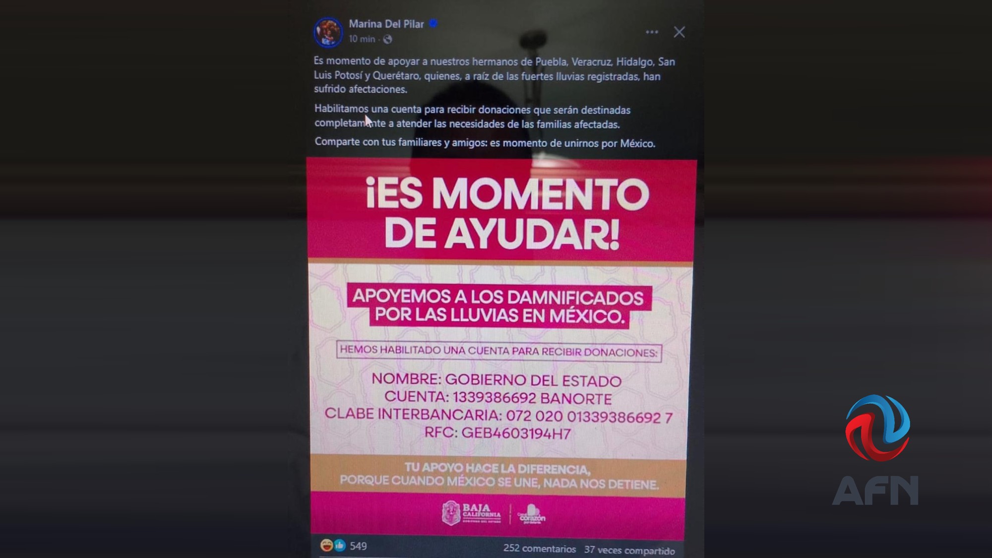 Con motivo de la situación tan delicada que viven damnificados de Puebla, Veracruz, Hidalgo, San Luis Potosí y Querétaro por las torrenciales lluvias que han generado no solamente inundaciones sino muertes, y han dejado a personas lesionadas y sin un lugar dónde vivir, se decidió hacer un llamado a la población de Baja California para que se sumara en apoyo de estas personas.