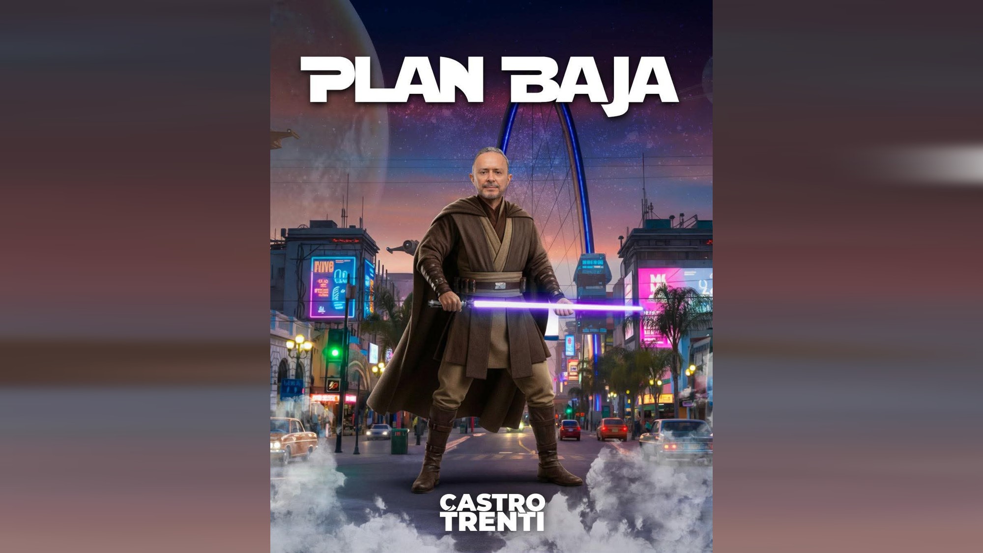 En la imagen en cuestión, se le ve vestido a la usanza monástica, como se representan los integrantes de las "fuerzas reales" del planeta ficticio de Naboo, y como era de esperarse, a punto de desenfundar su reluciente espada para proteger su "mundo", bajo la leyenda Plan Baja.