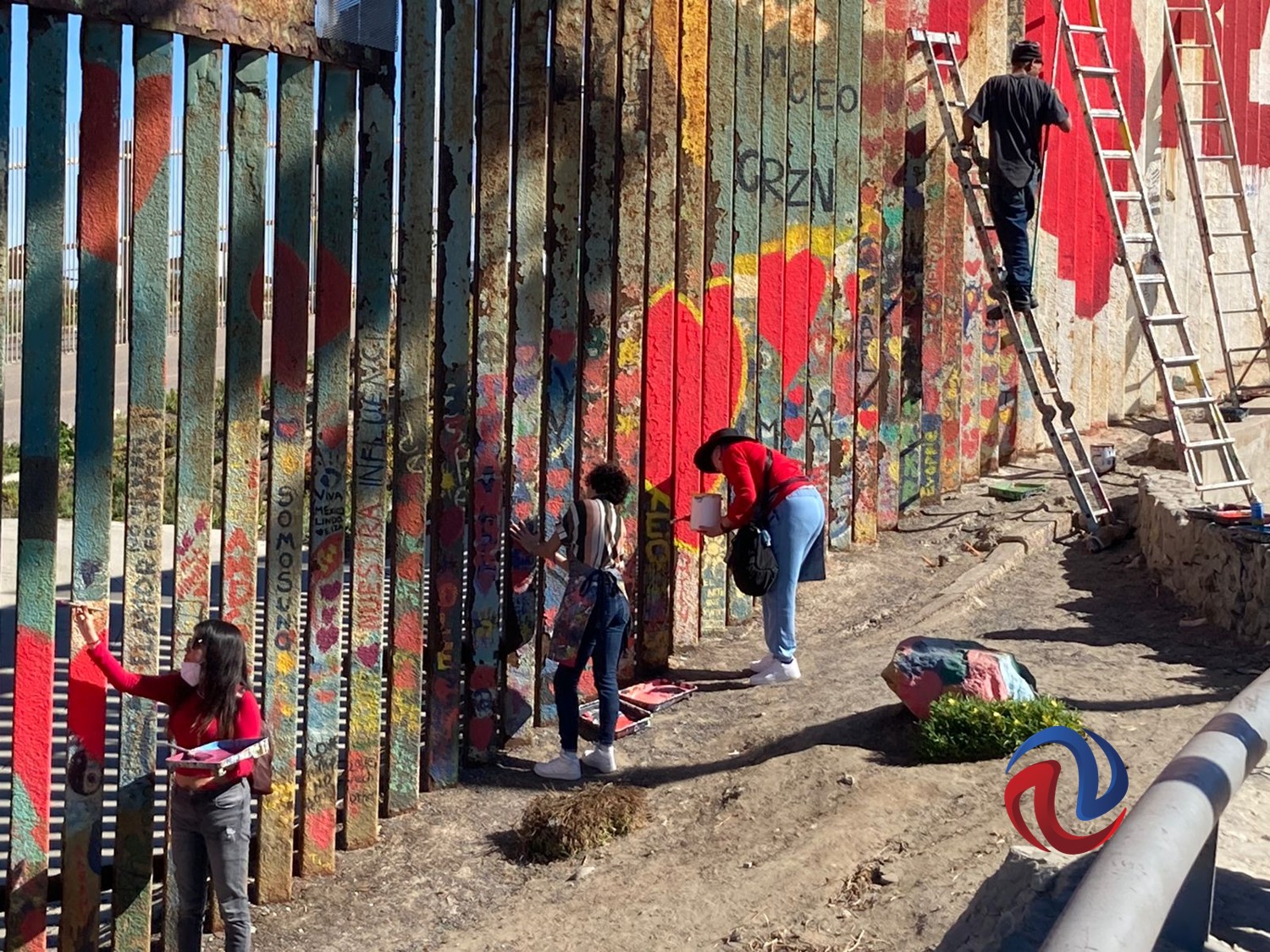 TIJUANA BC 13 DE FEBRERO DE 2022 (AFN).- Entre migrantes, extranjeros y artistas, se sumaron a la reactivación del proyecto Mural de la Hermandad, en Playas de Tijuana, pintando esta barrera que divide a México con Estado Unidos.