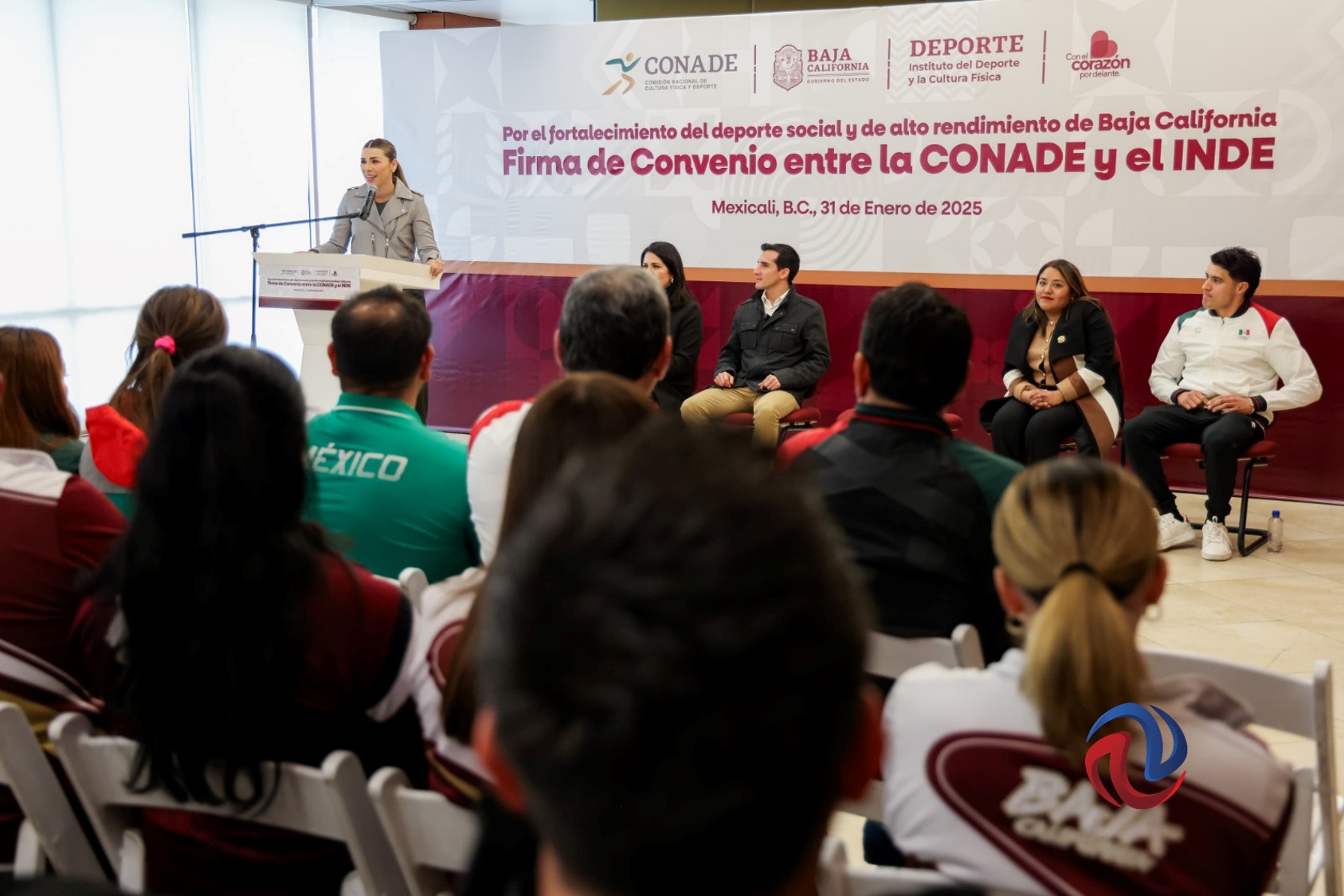 MEXICALI BC 31 DE ENERO DE 2025 (AFN).- Un convenio de colaboración para impulsar el deporte en la entidad, fue firmado esta mañana por la gobernadora Marina del Pilar Avila Olmeda, y Romel Pacheco Marrufo, director de la Comisión Nacional de Cultura Física y Deporte (Conade).