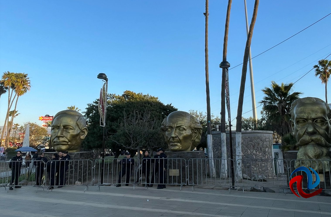 ENSENADA BC 8 MARZO 2025 (AFN).- Los monumentos ubicados en la Plaza Cívica de la Patria de esta ciudad, fueron resguardados con rejas y vigilancia de policías mujeres, ante la llegada de una marcha feminista programada para hoy sábado, en el marco de la conmemoración del Día Internacional de la Mujer,
