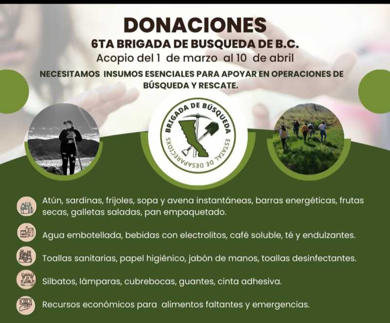MEXICALI BC 23 DE MARZO DE 2025 (AFN).- La sexta brigada de búsqueda internacional se llevará a cabo en Baja California del 20 de abril al 5 de mayo próximo, informó Alfredo Hernández, del colectivo Madres Unidas y Fuertes y coordinador de esta brigada.