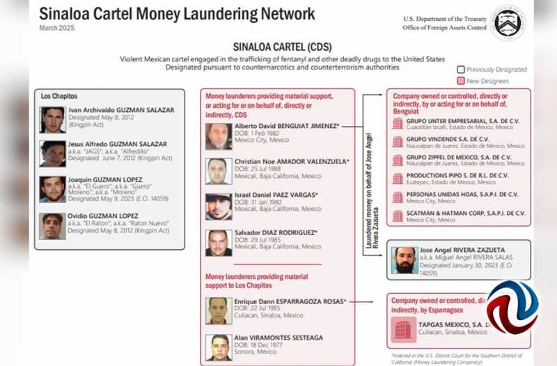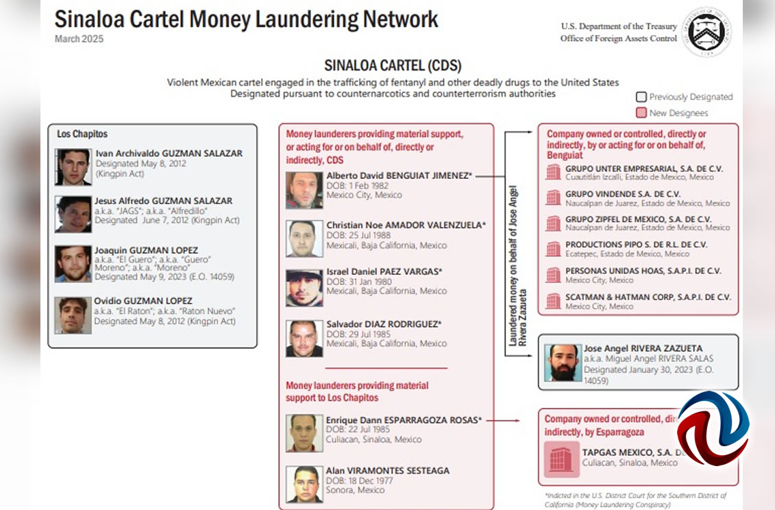TIJUANA BC 31 DE MARZO DE 2025 (AFN).- El Departamento del Tesoro de Estados Unidos, a través de la Oficina de Control de Activos Extranjeros (OFAC, por sus siglas en inglés) acusó a seis personas y siete empresas de vínculos con una red de lavado de dinero del Cártel de Sinaloa; entre estos se identificó a tres mexicalenses.